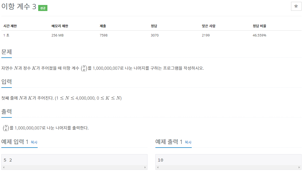 문 제 소 스 코 드 #include typedef long long INT; constexpr INT P { 1'000'000'007 }; void Remain_Pow(const INT& , int , INT& ); void Binomial(); int main() { std::ios_base::sync_with_stdio(false); std::cin.tie(NULL); std::cout.tie(NULL); Binomial(); return 0; } void Remain_Pow(const INT& a, int b, INT& r) { INT temp{ a }; while (0 != b) { if (b & 1) r = (r * temp) % P; temp = (temp * temp) % P; b >>= ..