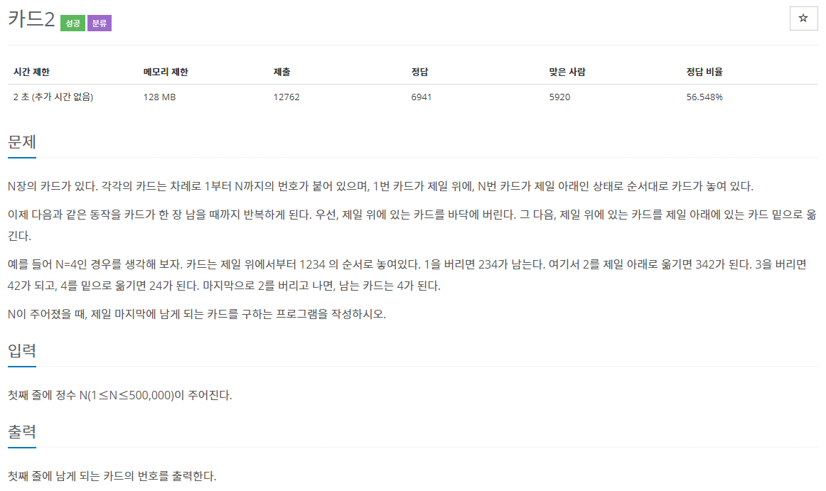 문 제 소 스 코 드 #include #include int main() { std::queue que; int N; std::cin.tie(NULL); std::ios_base::sync_with_stdio(false); std::cin >> N; for (int i = 0; i < N; ++i) que.push(i + 1); bool tf{ false }; while (1 != que.size()) { if (false == tf) { que.pop(); tf = true; } else { que.push(que.front()); que.pop(); tf = false; } } std::cout