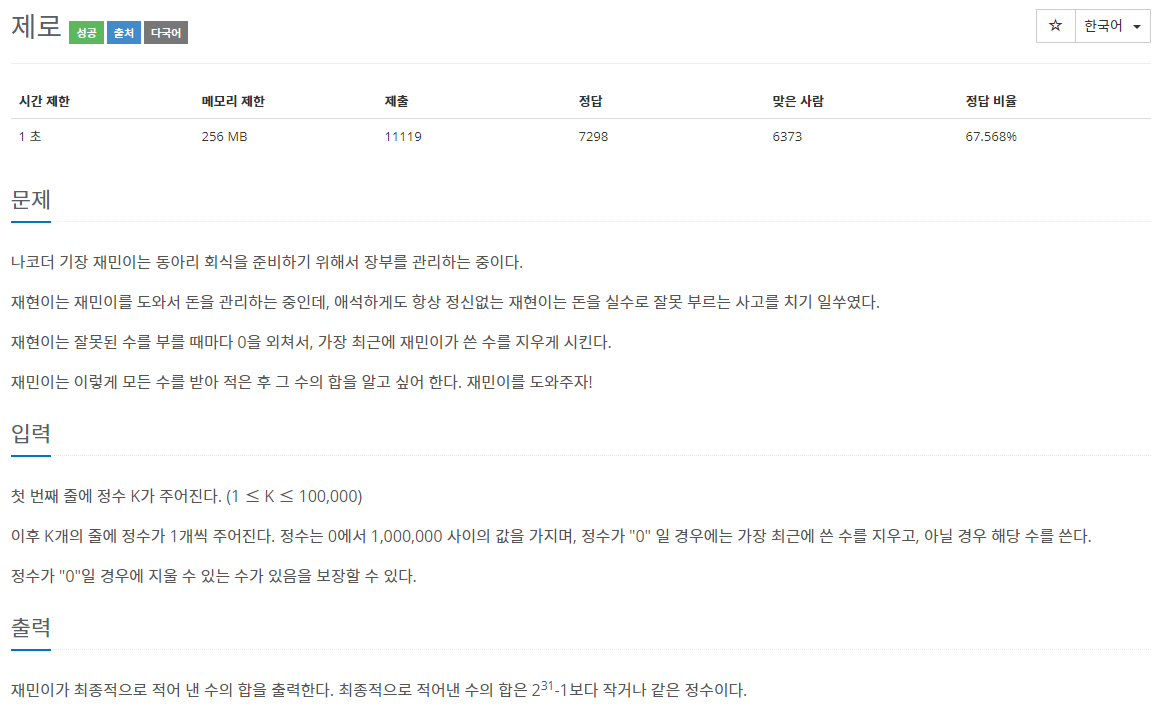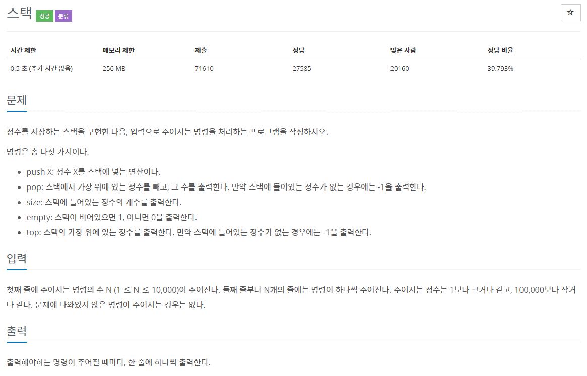 문 제 소 스 코 드 #include #include constexpr int MAX_SIZE{ 10'000 }; class Stack { private: int m_top; int m_size; int *index; public: Stack() : m_top{ 0 }, m_size{ 0 }, index{ new int[MAX_SIZE] }{} ~Stack() { delete[] index; } void Push(const int&); const int Pop(); int Size() const; bool Empty() const; int Top() const; }; void Stack::Push(const int& n) { index[m_size] = n; ++m_size; m_top = n; } co..
