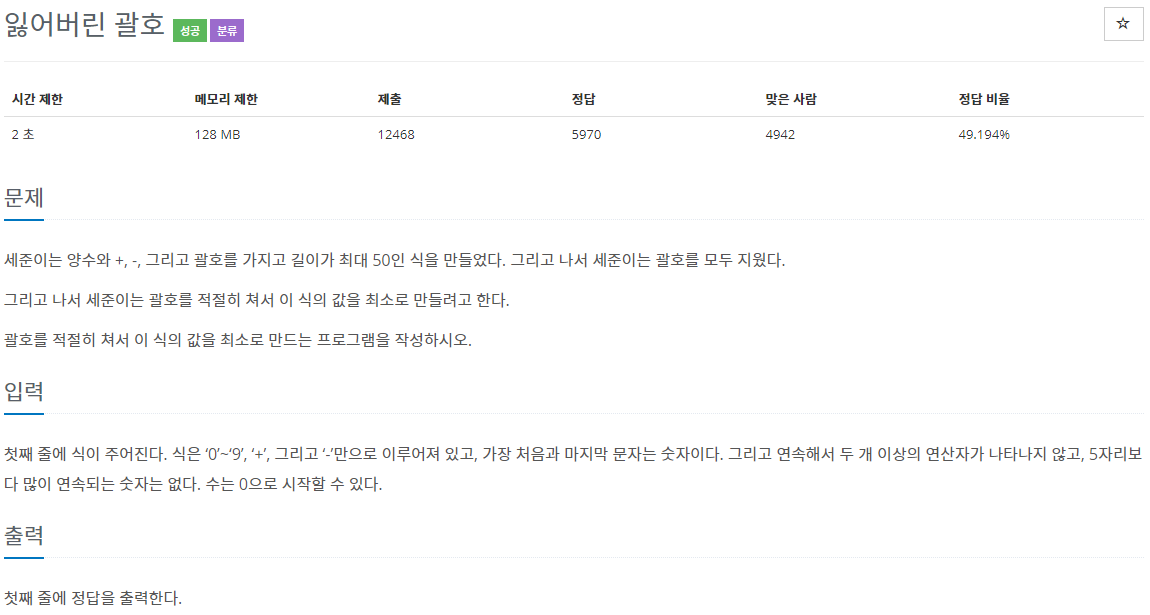 문 제 소 스 코 드 #include #include #include constexpr int MAX_NUM{ 5 }; const int Combine(std::vector&); int main() { std::string expression; std::cin >> expression; std::vector temp; temp.reserve(MAX_NUM); bool tf{ false }; int num{ 0 }; int number{ 0 }; for (int i = 0; i < expression.length() + 1; ++i) { if('0' = expression[i]) temp.emplace_back(expression[i] - 48); else if ('-' == expression[i]) {..