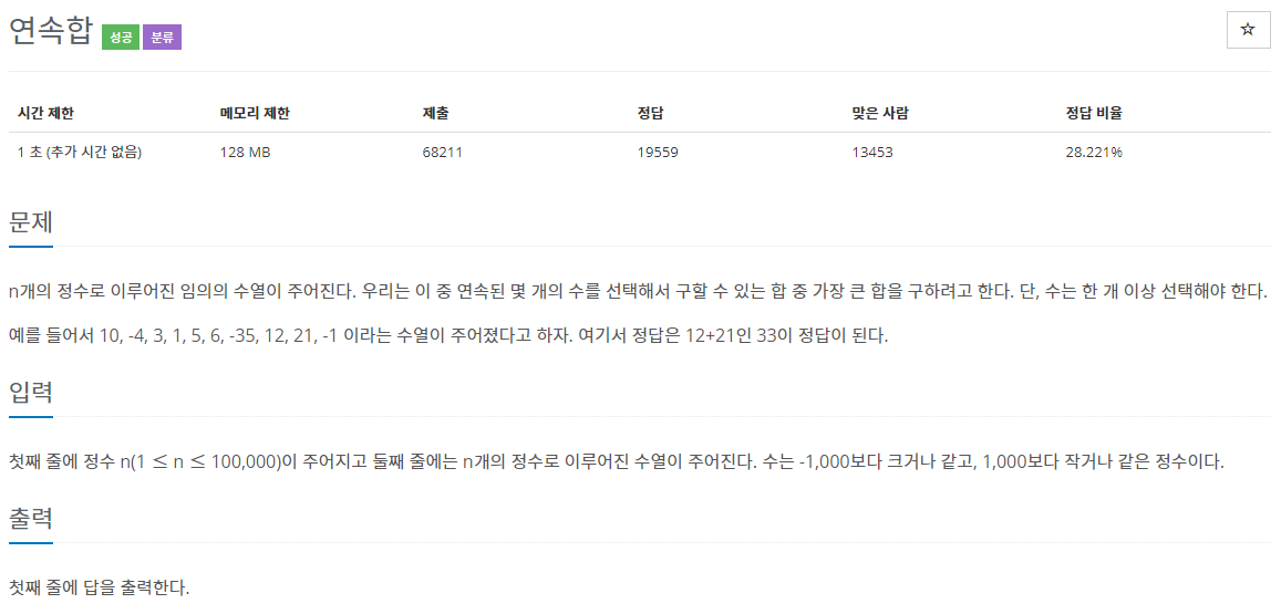 문 제 소 스 코 드 #include #include constexpr int MIN_INT{ -1'000'000'000 }; int main() { int N; std::cin >> N; int *seqadd{ new int[N] }; int *dp{ new int[N] }; std::fill_n(dp, N, 0); for (int i = 0; i > seqadd[i]; dp[0] = seqadd[0]; int maxnum{ dp[0] }; for (int i = 1; i < N; ++i) { dp[i] = std::max(dp[i - 1] + seqadd[i], seqadd[i]); maxnum = std::max(maxnum, dp[i]); } std::cout