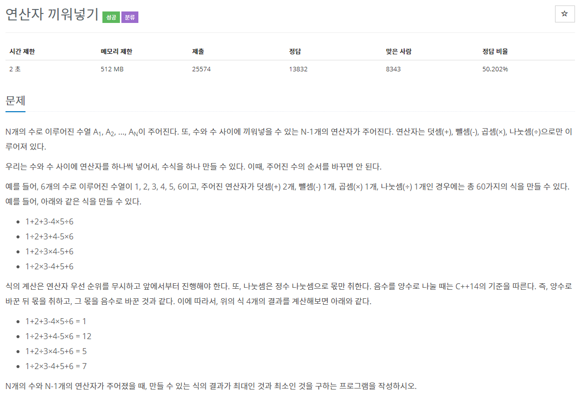 [BAEKJOON] 14888번 연산자 끼워넣기 문 제 소 스 코 드 #include constexpr int ADD{ 0 }; constexpr int MINUS{ 1 }; constexpr int MULTIPLY{ 2 }; constexpr int DIVISION{ 3 }; constexpr int MAX_NUMBER{ 1'000'000'000 }; constexpr int MIN_NUMBER{ -1'000'000'000 }; int min_number{ MAX_NUMBER }; int max_number{ MIN_NUMBER }; int temp_number; void Func(const int&, const int&, int *, int* ); int Operator(const int& , int& , const int& ); int main(.. [ ALGORITHM ]/[ 백 준 ] 2020.06.19