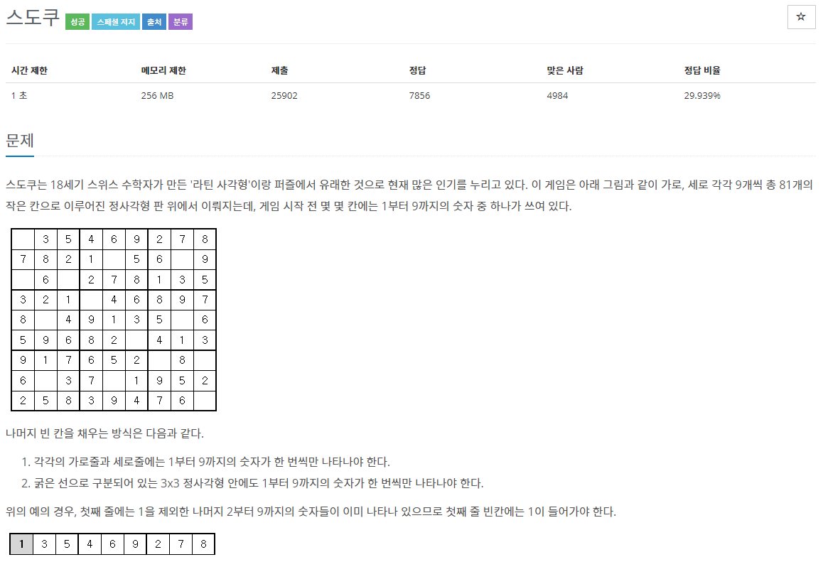 [BAECKJOON] 2580번 스도쿠 문 제 소 스 코 드 #include #include constexpr int MAX_BOARD{ 9 }; constexpr int SUDOKU_EMPTY{ 0 }; void Func(const int&); bool Is_Exist(const int&, const int&); void Display(); int sudoku_board[MAX_BOARD][MAX_BOARD]; std::vector sudoku; bool finish{ false }; int main() { // reserver vector sudoku.reserve(MAX_BOARD * MAX_BOARD); // input & search 0 index for (int y = 0; y < MAX_BOARD; ++y) { for (int x.. [ ALGORITHM ]/[ 백 준 ] 2020.06.18