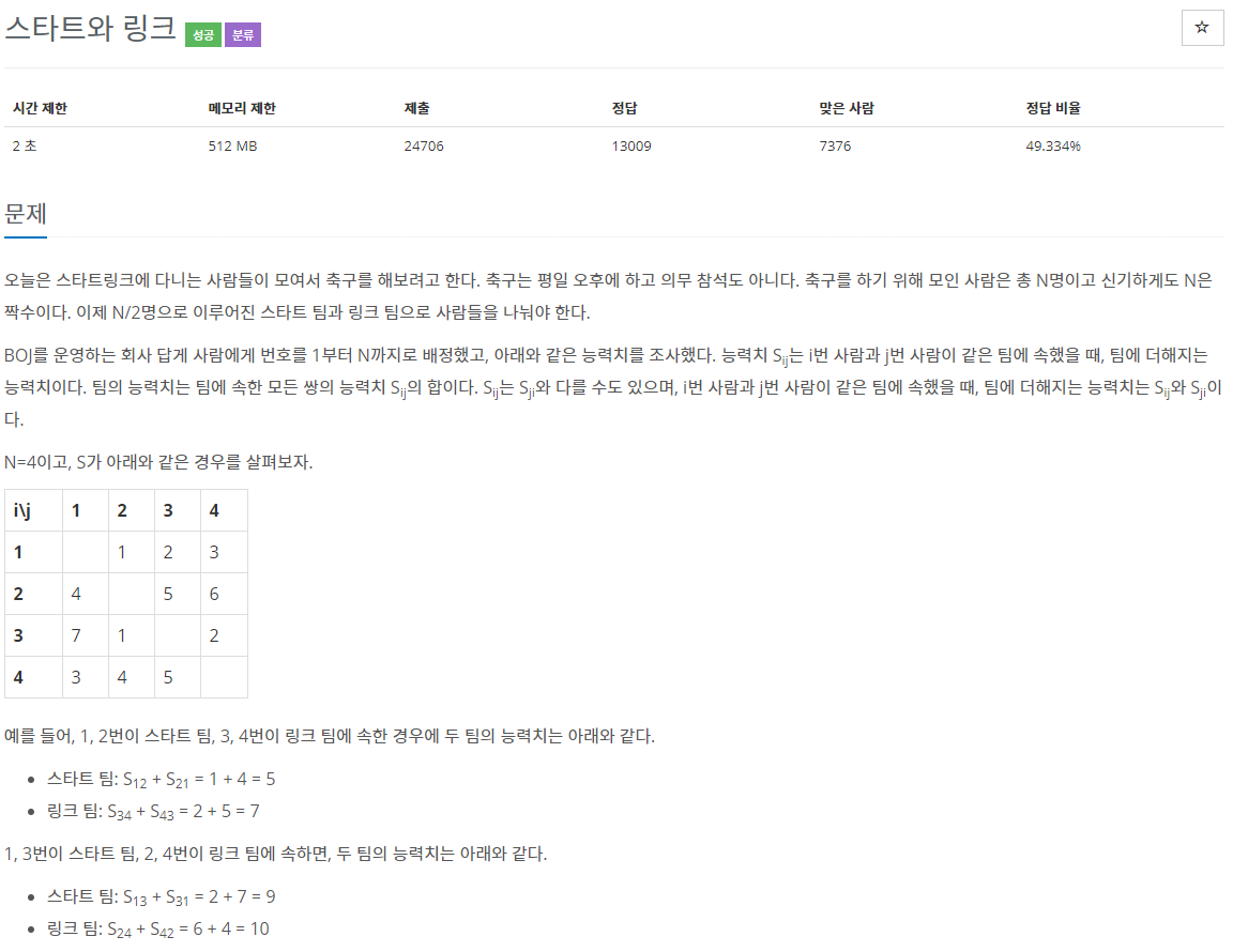 [BAEKJOON] 14889번 스타트와 링크 문 제 소 스 코 드 #include #include void Func(const int&, const int&, const int&, bool *, int **); int min_number{ 1'000'000'000 }; int arr[4]; int main() { int N; std::cin >> N; if (!(4 temp[i][j]; } } Func(0, N, 0, temp_tf, temp); std::cout minus_temp) min_number = minus_temp; return; } for (int i = start; i < N; ++i) { if (true == temp_tf[i]) continue; temp_tf[i] = true; arr[count] = i + 1; Func(co.. [ ALGORITHM ]/[ 백 준 ] 2020.06.20