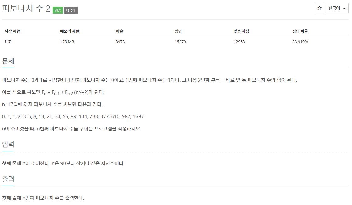 [BAEKJOON] 2748번 피보나치 수 2 문 제 소 스 코 드 #include int main() { int N; std::cin >> N; long long first_idx{ 0 }; long long second_idx{ 1 }; long long temp; for (int i = 0; i < N - 1; ++i) { temp = second_idx; second_idx = first_idx + second_idx; first_idx = temp; } std::cout [ ALGORITHM ]/[ 백 준 ] 2020.06.21