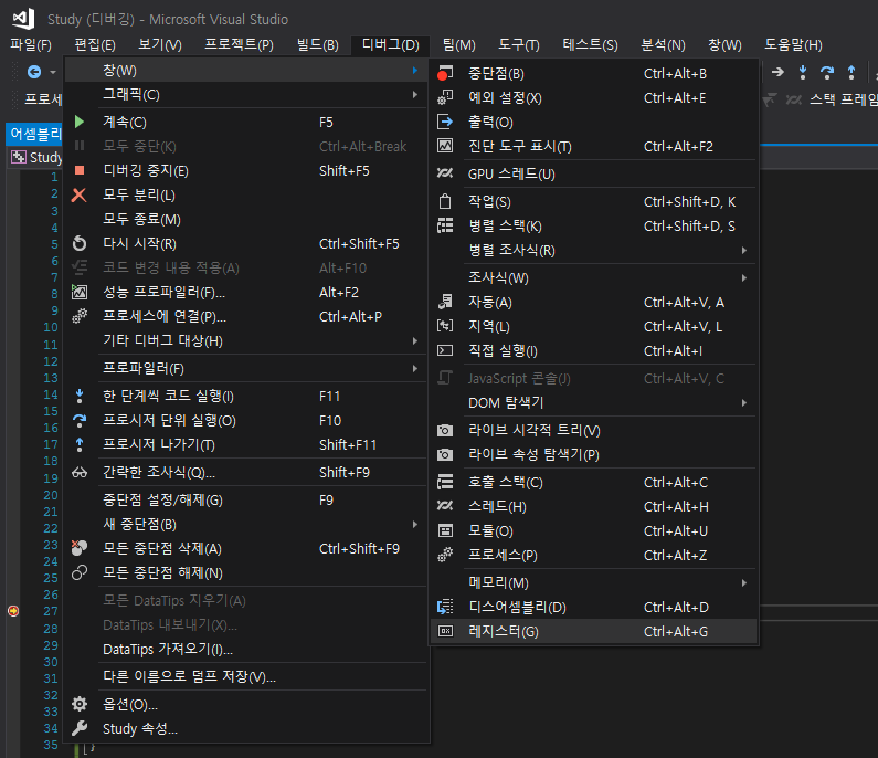 어 셈 블 리 어셈블리어 : 기계어에서 한 단계 위의 언어이며 기계어와 함께 단 둘뿐인 저급언어. 인라인 어셈블리를 통하여 직접적으로 어셈블리 언어를 입력하여, 원하는 어셈블리 코드를 짤 수 있지만, 32bit만 가능하다. 그렇기 때문에, 코드를 개발하는 단계에서 어셈블리 명령어가 깔끔하게 나오도록 코드를 짜려고 노력하는 습관을 들어야 한다. CPU 레지스터 레지스터 : CPU 내부에서 처리할 명령어나 연산의 중간 값 등을 일시적으로 기억하는 임시 기억장소. Visual Studio 레지스터 EAX = 00ECC003 eax ( Extended Accumulator Register ) : 산술, 논리 연산에 사용하는 레지스터. EBX = 010B3000 ebx ( Extended Base Register..