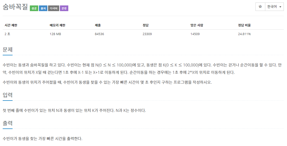 문 제 소 스 코 드 #include #include #include constexpr int MAX{ 100'000 }; typedef std::queue BFS; bool arr[MAX + 1] = { false , }; int main() { std::ios_base::sync_with_stdio(false); std::cin.tie(NULL); std::cout.tie(NULL); int N, K; std::cin >> N >> K; BFS bfs; bfs.push(std::make_pair(N, 0)); arr[N] = true; int sec{ 0x7fff'ffff }; while (!bfs.empty()) { int pos{ bfs.front().first }; int level{ bfs.f..